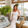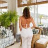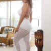 Vestido longo de crochê, feito à mão, com linha na cor branca. Detalhes com flor frontal, costas abertas e cinto de franjas para amarração.